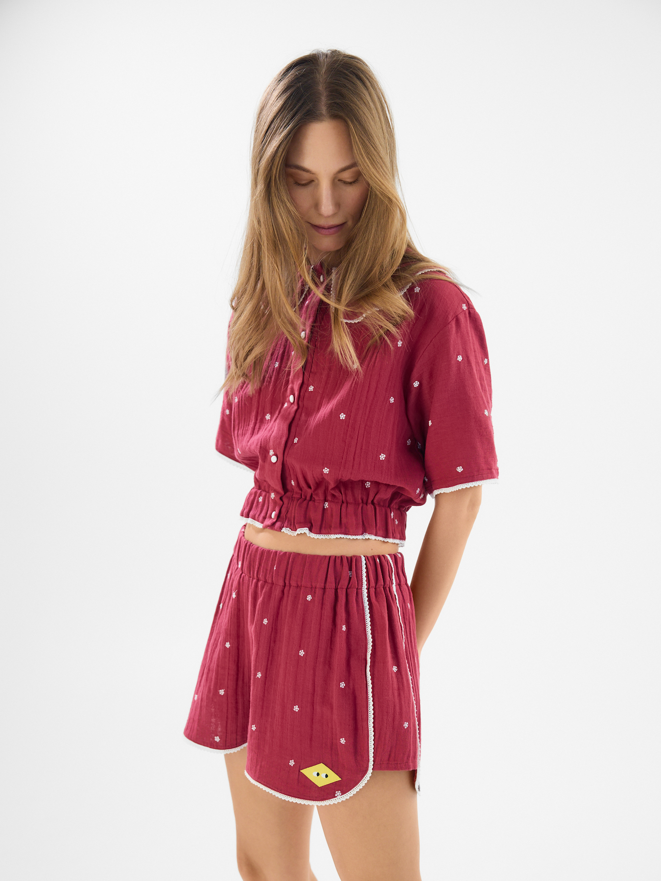 Colectia include jachete cu paspoal contrastant si gulere supradimensionate; un set din muselina, compus din bluza si pantaloni scurti ce pot fi purtate impreuna sau separat – intr-o nuantaburgundy cu imprimeu buline; o vesta matlasata cu detalii contrastante; o geanta tip messenger purtata crossbody si un breloc-pouch care poate fi atasat gentii sau purtat individual; un gulerdetasabil disponibil in doua variante, gandit pentru a fi integrat in stylinguri cu pulovere, hanorace sau tricouri; un sort si un scrunchie.